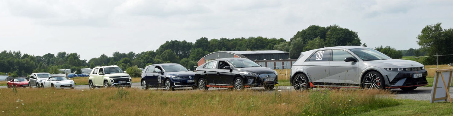 Insgesamt 2 Tesla Roadster, 2 VW und erstmals 3 Hyundai (Ioniq 5N, Inster und Ioniq FL) starteten auf dem 2,23 km langen Rundkurs, der im Industriepark auf dem ehemaligen Bundeswehr-Flugplatz angelegt wurde. Die erste Rennhälfte dominierte dann auch Hyundai Ioniq 5-N-Pilot und Lokalmatador Jürgen Mannshardt, der mit seinem 650 PS starken Boliden vorneweg fuhr und den Verfolgern zunächst nicht den Hauch einer Chance ließ. Mannshardt war einer von 2 Gaststartern des von der Motorsport Equipe Nord organisierten „eCup Nord“, zu dem in diesem Jahr neben einigen Slaloms auch die EEC-Runde zählt. Allerdings gilt der Hyundai 5N nicht als sonderlich sparsames Fahrzeug, weswegen Mannshardt sein Fahrzeug schon nach etwas über der Hälfte der Renndistanz abstellen musste, da er das vorgegebene Energielimit von 18kWh (entspricht der Energiemenge in 2l Benzin) schon aufgebraucht hatte.
